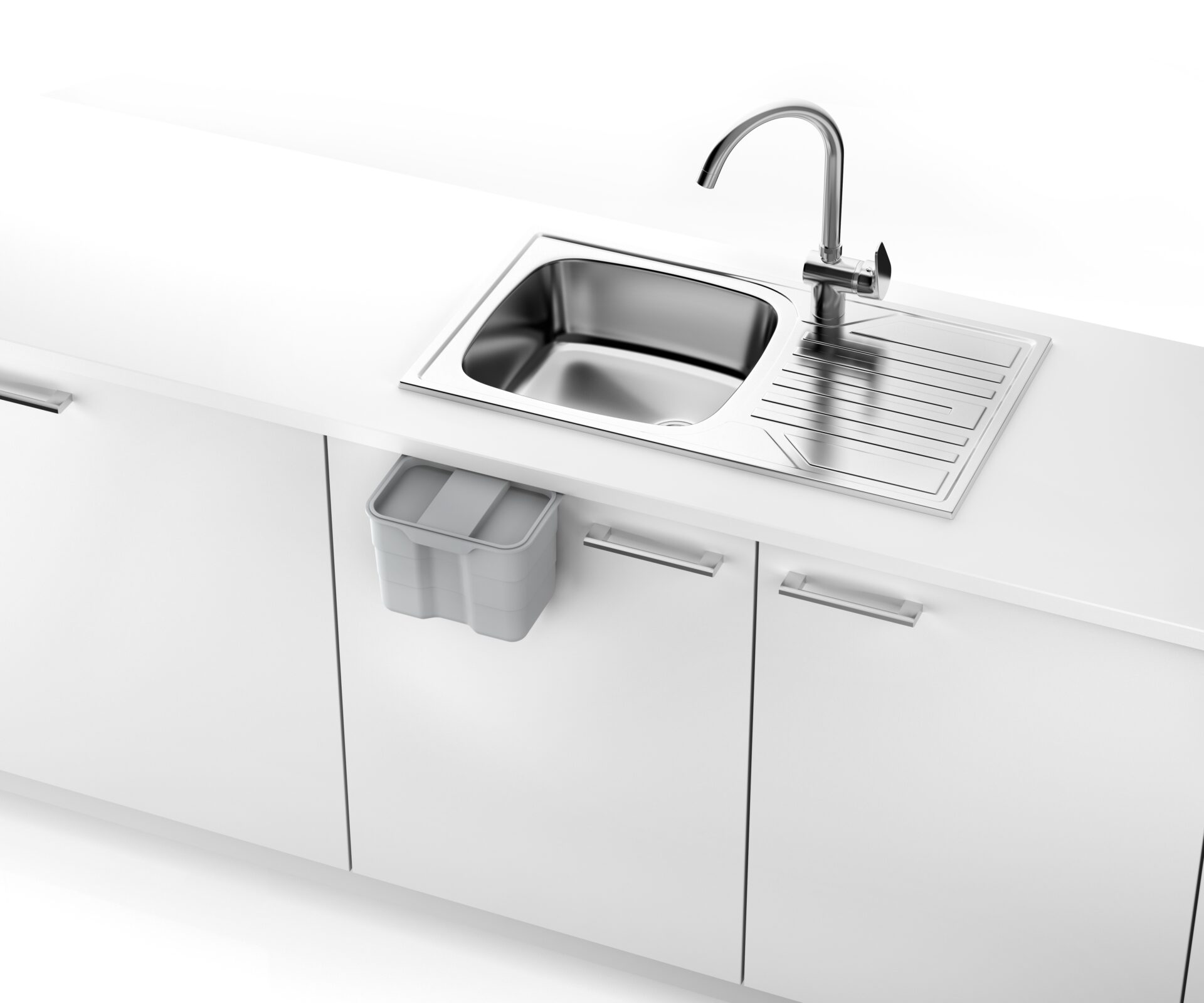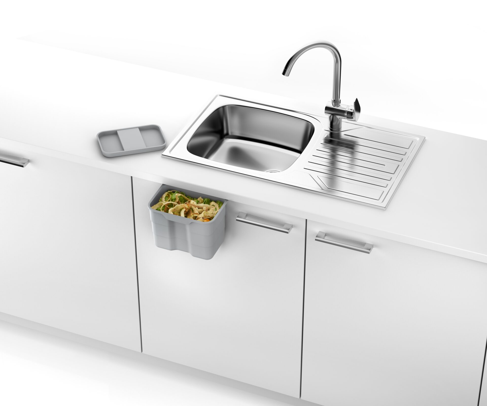 Bac à compost de 4,2 litres (1,1 gallon) livré avec un couvercle qui s’accroche simplement sur le dessus d’une porte on dans un bac Cargo.