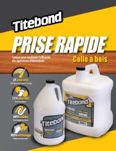 La colle à bois à durcissement rapide Titebond est un adhésif à haute teneur en solides PVA qui prend très rapidement. Elle possède d’excellentes propriétés de remplissage en créant un liant encore plus solide que le bois lui-même. Ce produit est facile à poncer, n’est pas altéré par les finis et permettre d’améliorer la productivité en limitant le temps de serrage sans pour autant augmenter la viscosité. La colle à bois à durcissement rapide Titebond n’est pas toxique et se lave à l’eau.