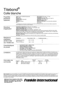 La colle blanche économique Titebond assure une adhérence exceptionnelle et une prise plus rapide que la plupart des colles semblables. Sa formule polyvalente est idéale pour les travaux d’ébénisterie et convient à de nombreux matériaux poreux et semi-poreux. Elle présente des joints de colle translucides, une excellente aptitude au ponçage et ne réagit pas aux finis. Facile à utiliser et non toxique, elle se lave facilement avec de l’eau.