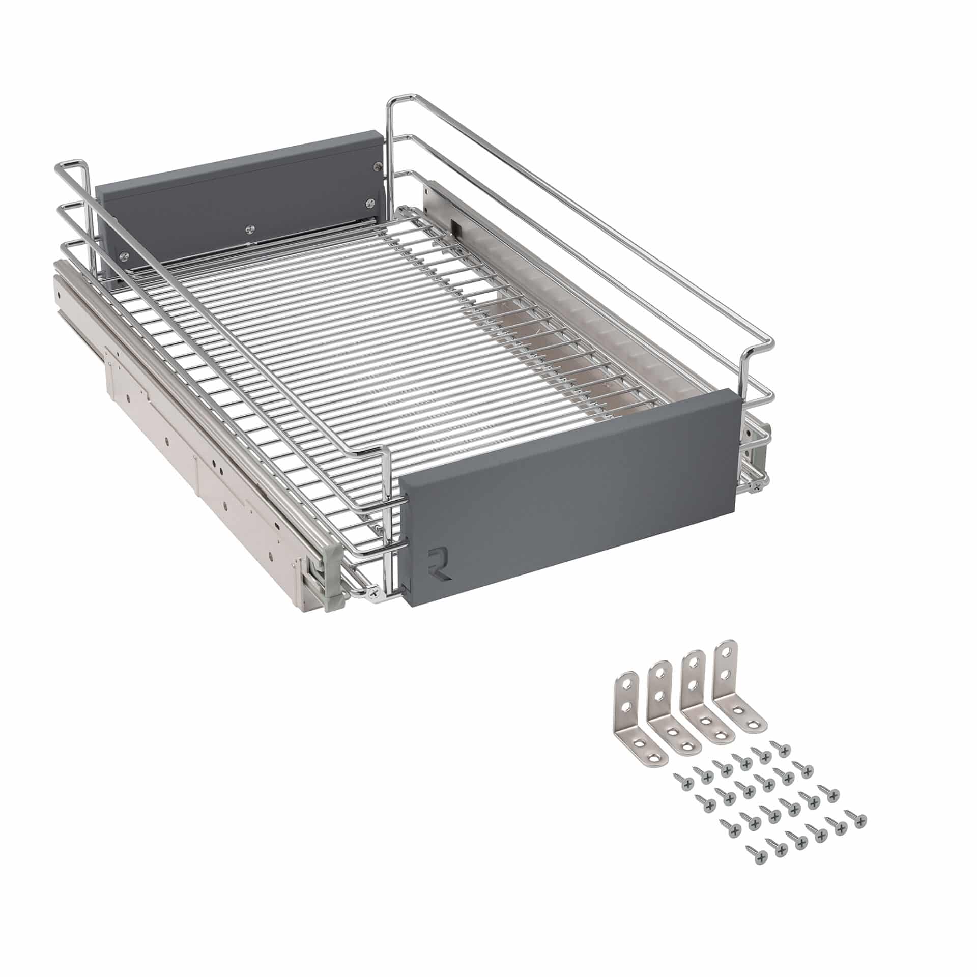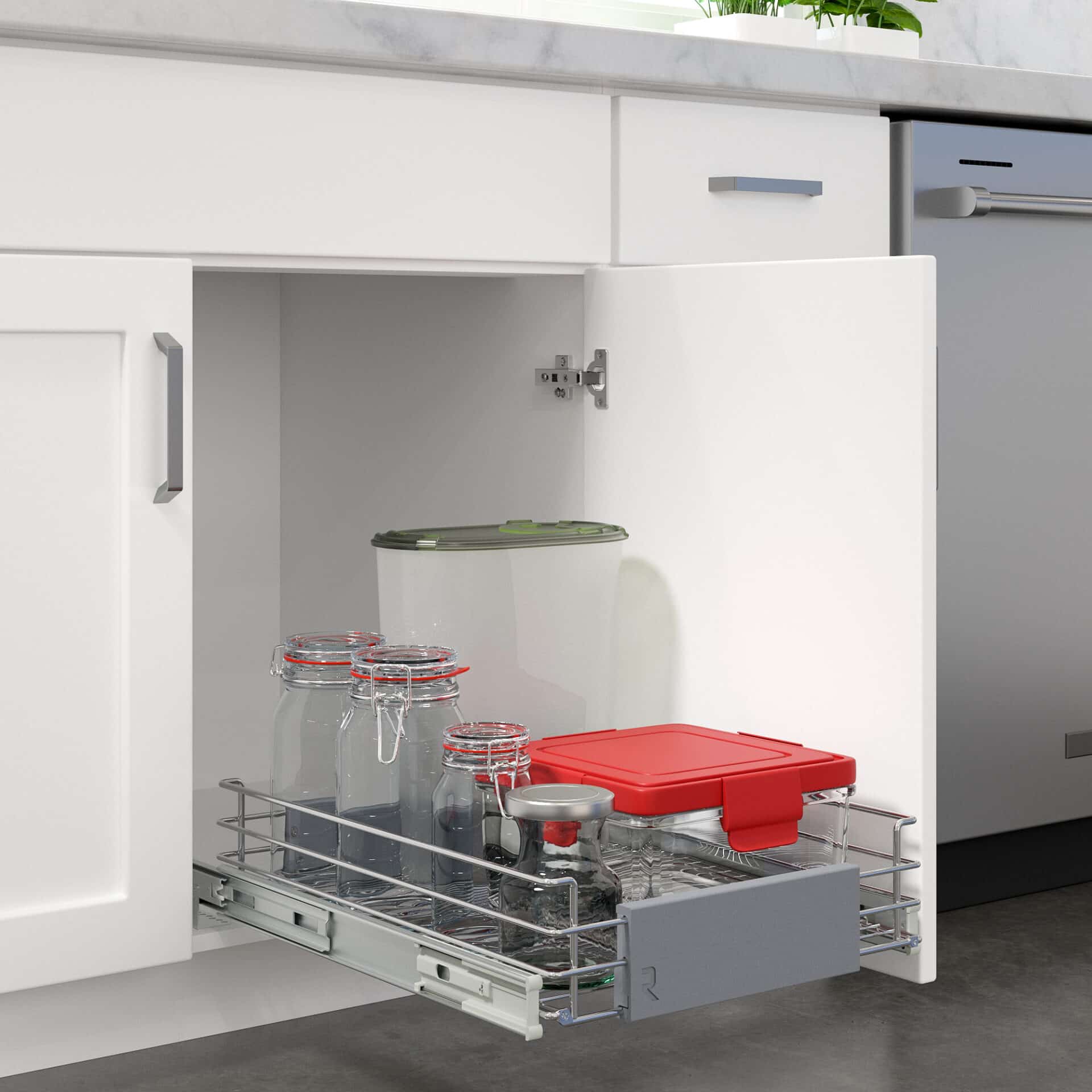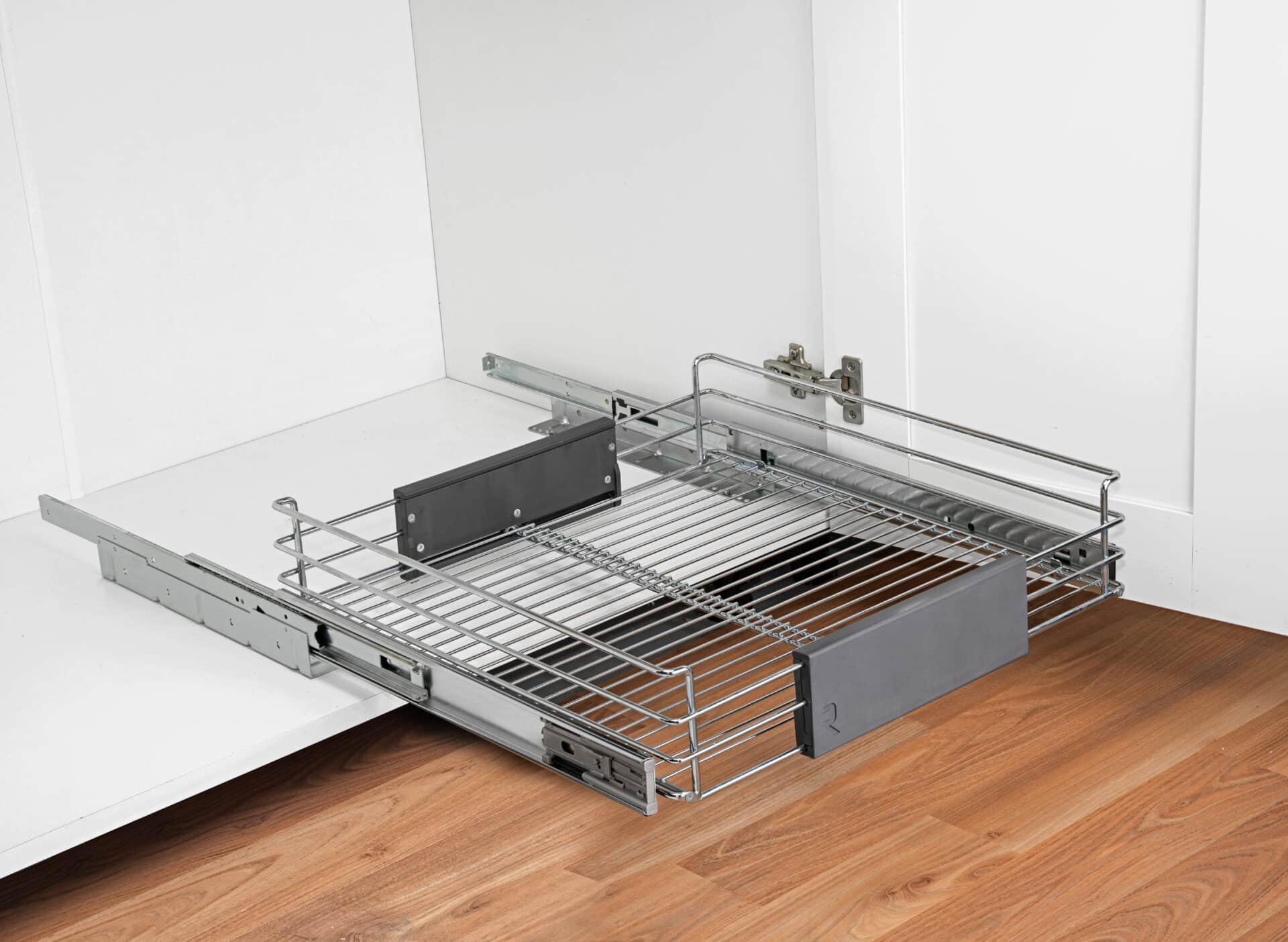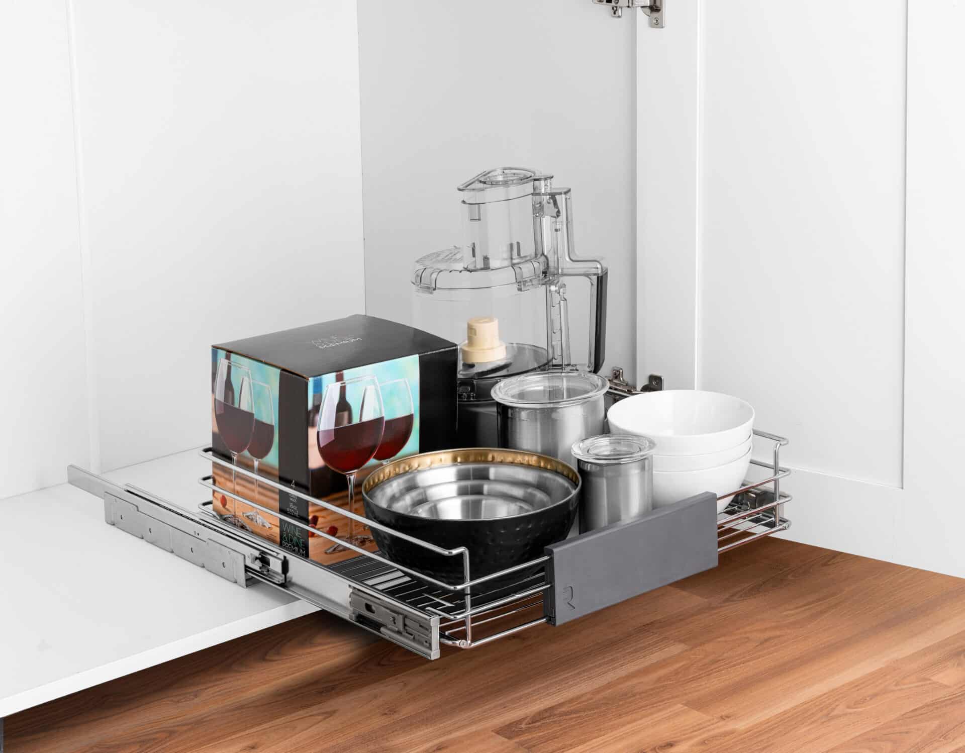 Panier ajustable coulissant avec amortisseur parfait pour votre rangement dans la cuisine ou pour tout autre projet. Son ajustement en largeur permet de maximiser l’espace.