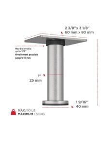 Les pattes sont faciles à installer et sont équipées de niveleurs qui permettent d’en ajuster la hauteur jusqu’à 10 mm sur les sols irréguliers.