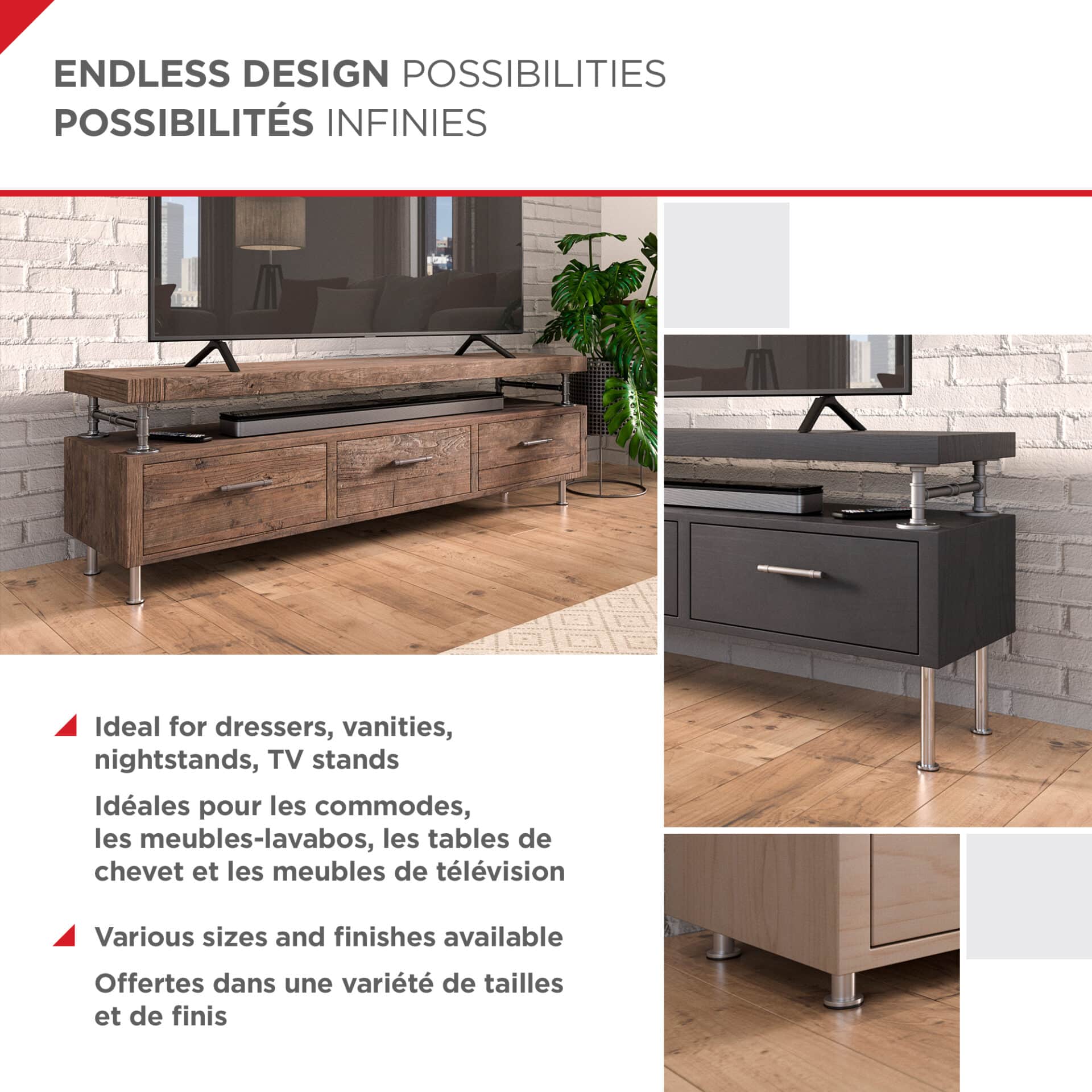 Ces pattes de meubles robustes, de style industriel, sont offertes dans une variété de tailles et de finis; vous pouvez donc les marier avec différents meubles dans votre maison ou dans une même pièce pour un look homogène.