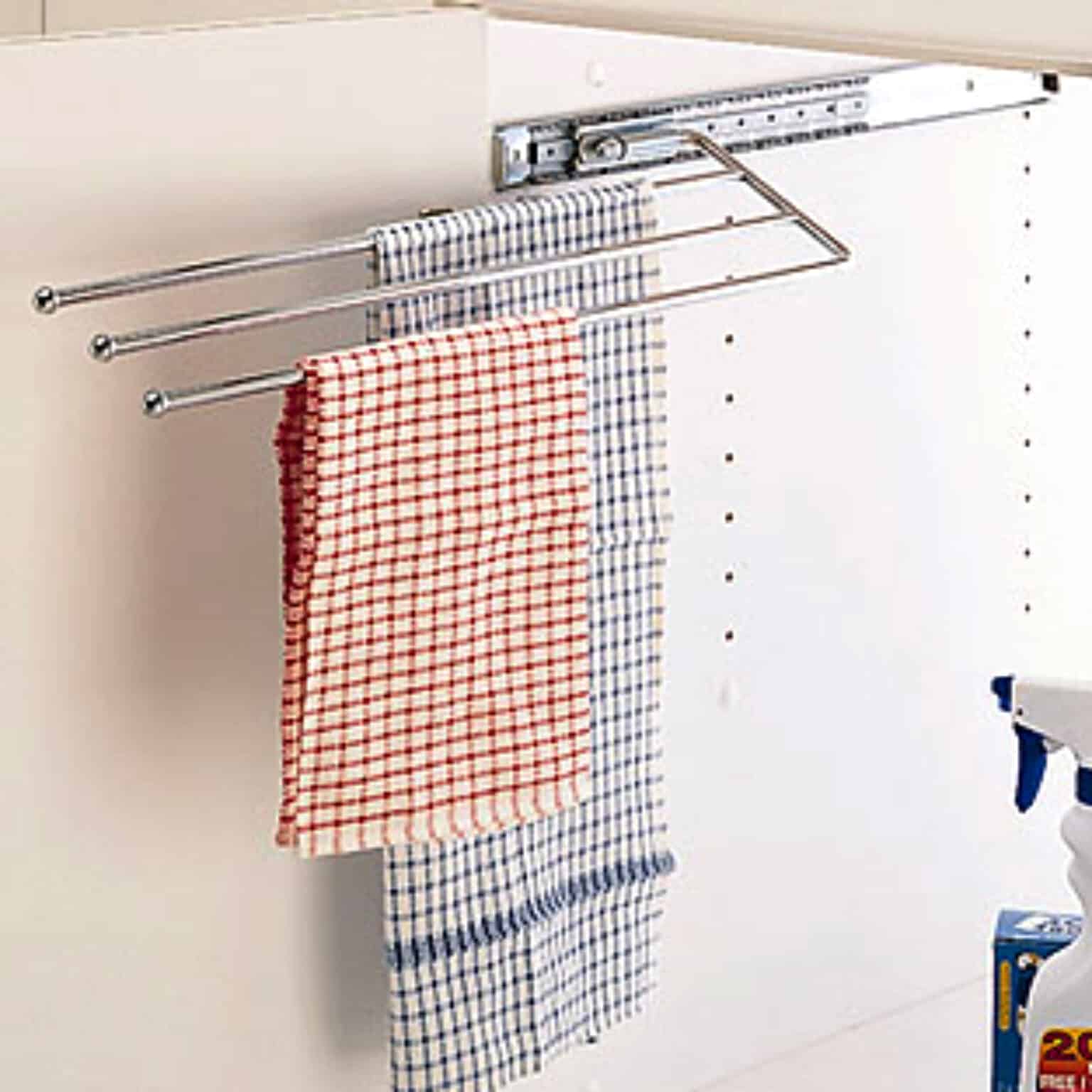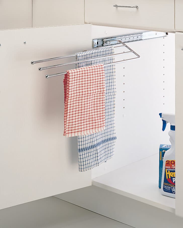 – Porte-serviettes à trois branches pouvant être fixé au panneau du fond ou à même le panneau gauche ou droit situé sous votre surface de travail.