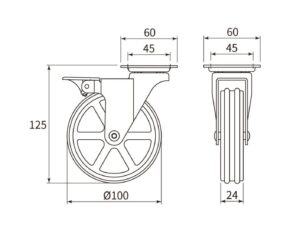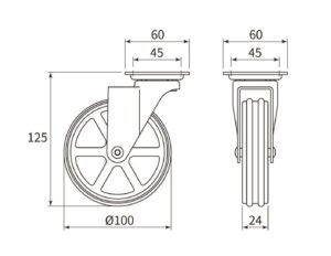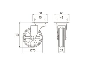 Roulette en aluminium noir sur noir qui ajoute une apparence vintage à vos meubles avec les fonctionnalités modernes d’une roulette. Disponible en deux hauteurs, avec ou sans frein.