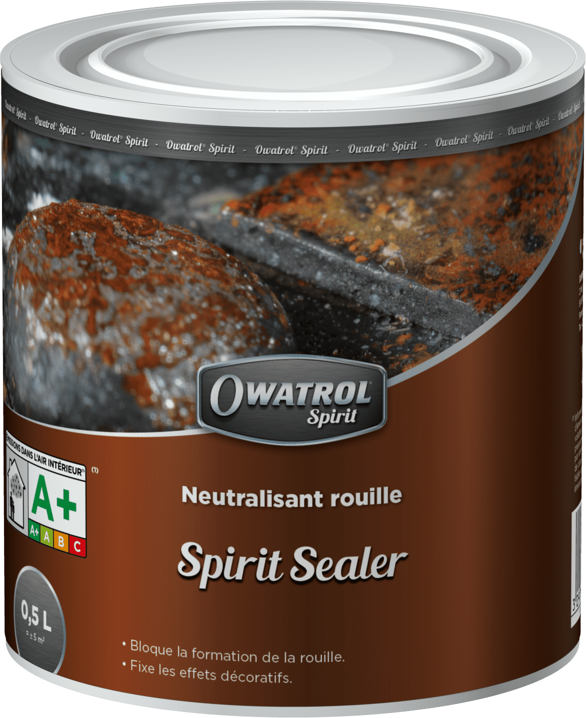 Neutralisez la rouille avec SPIRIT SEALER. À utiliser en combiné avec les systèmes RUST SPIRIT, COPPER SPIRIT et BRONZE SPIRIT. SPIRIT SEALER. Il permet d’arrêter l’action d’oxydation de ces trois produits et de fixer le décor et la couleur créés au moment désiré. Idéal pour vos travaux de rénovations et de home-staging.