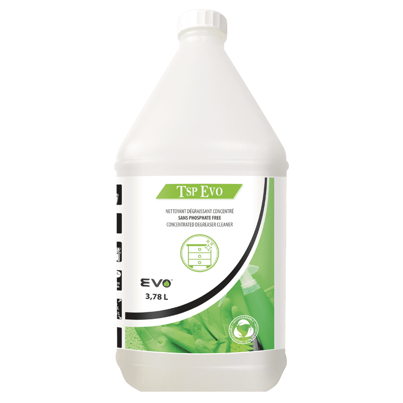 TSP par ÉVO est un dégraisseur organique biodégradable à base d’eau sans phosphate qui est utilisé pour nettoyer en profondeur une surface nue ou déjà peinte, avant de peinturer. D’une grande efficacité, ce produit enlève l’huile, la graisse, les traces de doigts, les tâches de fumée et autres contaminants, tout en améliorant l’adhérence et l’apparence des futurs revêtements. Il ne requiert aucun rinçage, il est sécuritaire et s’utilise sur toutes les surfaces (bois, peinture, gypse, mélamine, plastique, métal et verre). TSP ÉVO est un produit sans danger pour l’environnement et ne contient aucun phosphate.